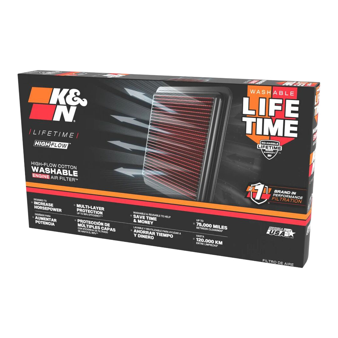 K&N zračni filter je zasnovan za povečanje pretoka zraka in izboljšanje odzivnosti plina. Globoke gube filtrirnega materiala omogočajo visoko prepustnost zraka ter dolge servisne intervale. Izdelan je iz kakovostnega bombažnega materiala z močno in prožno prirobnico, ki zagotavlja popolno tesnjenje.