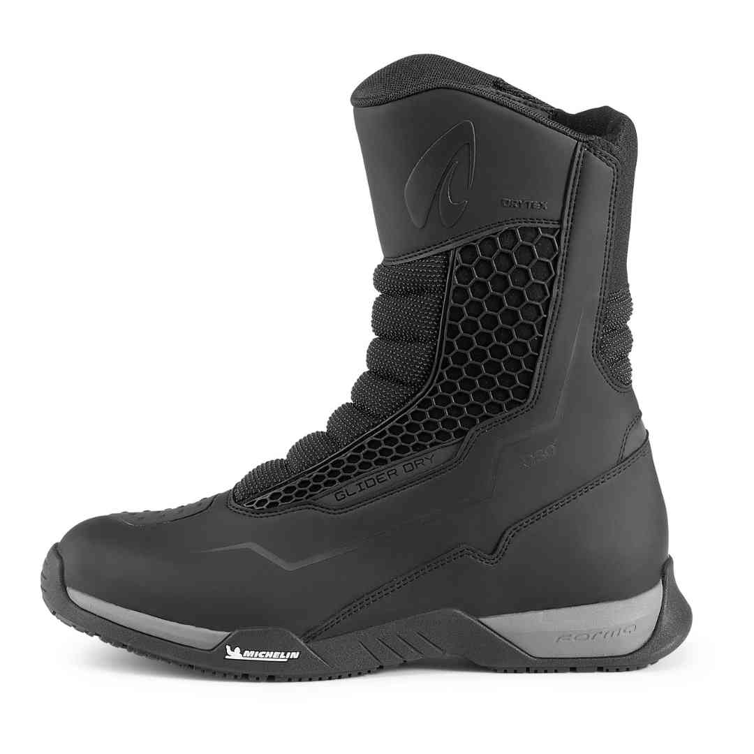 Forma Glider Dry so sodobni touring motoristični škornji, ki združujejo lahko konstrukcijo, napredno zaščito in visoko raven udobja. Namenjeni so cestni vožnji in daljšim potem, kjer sta pomembna zanesljiv oprijem in zaščita v vseh vremenskih pogojih.