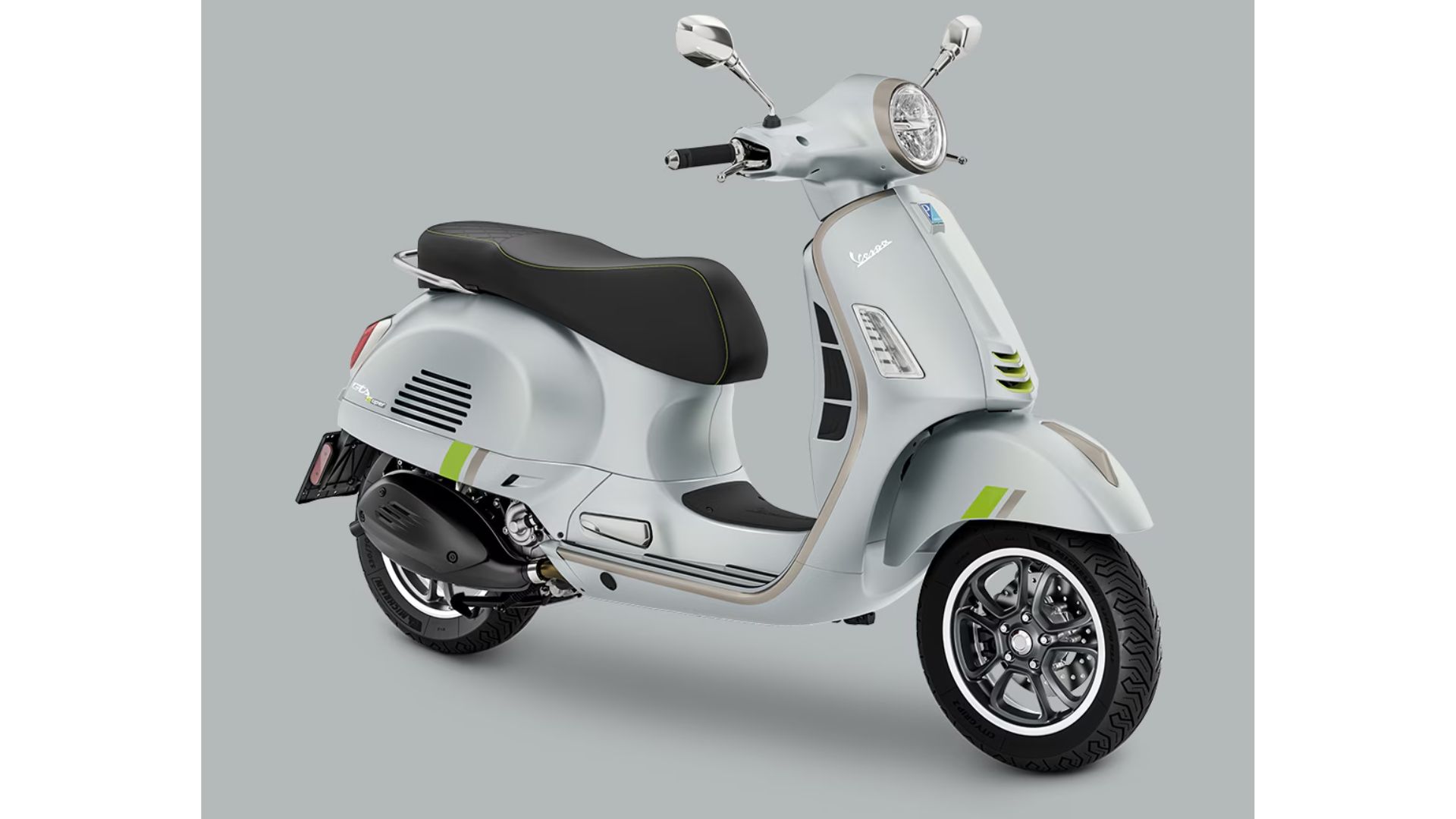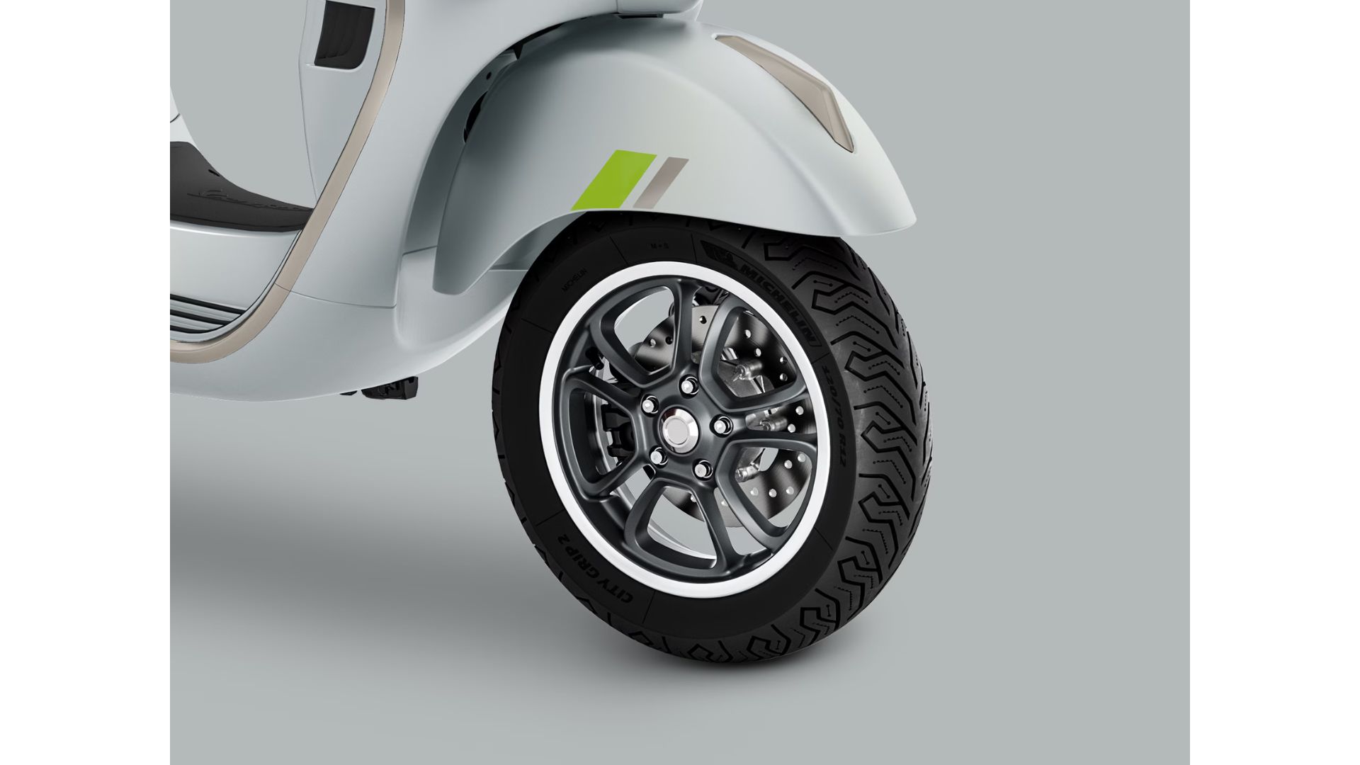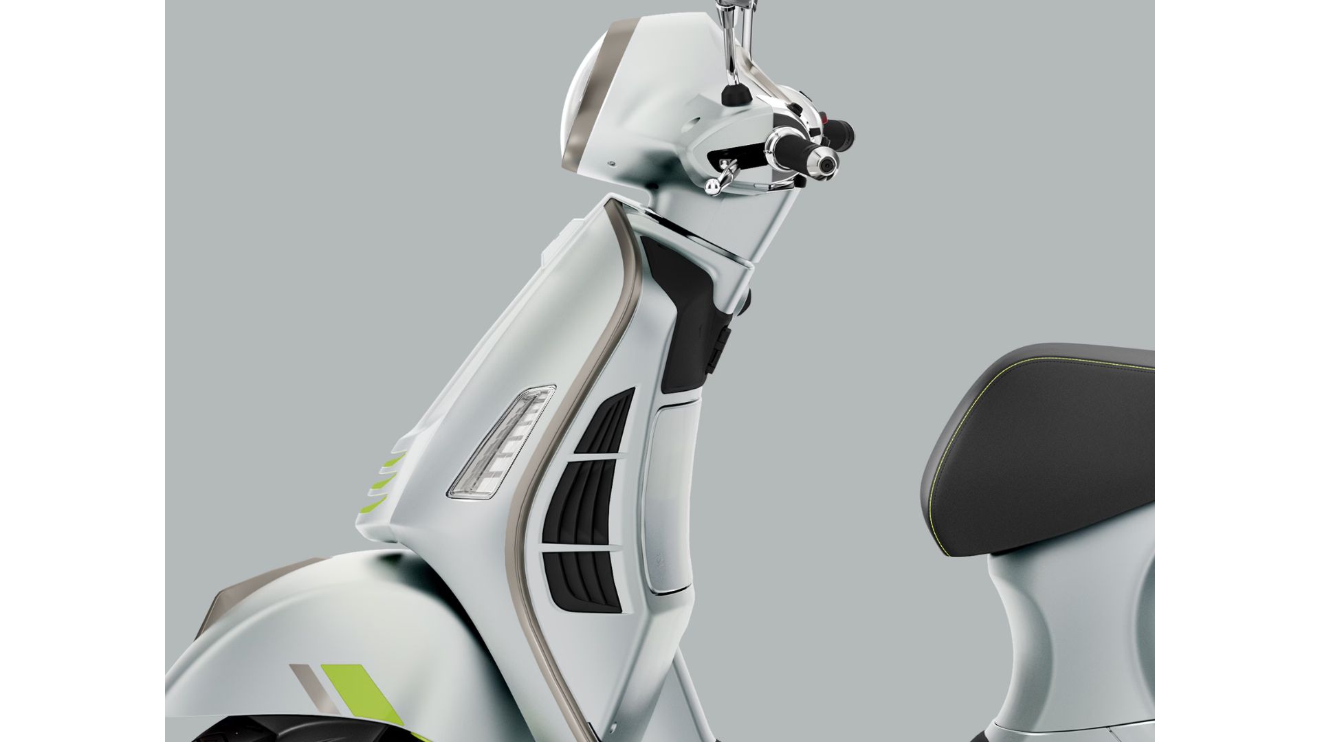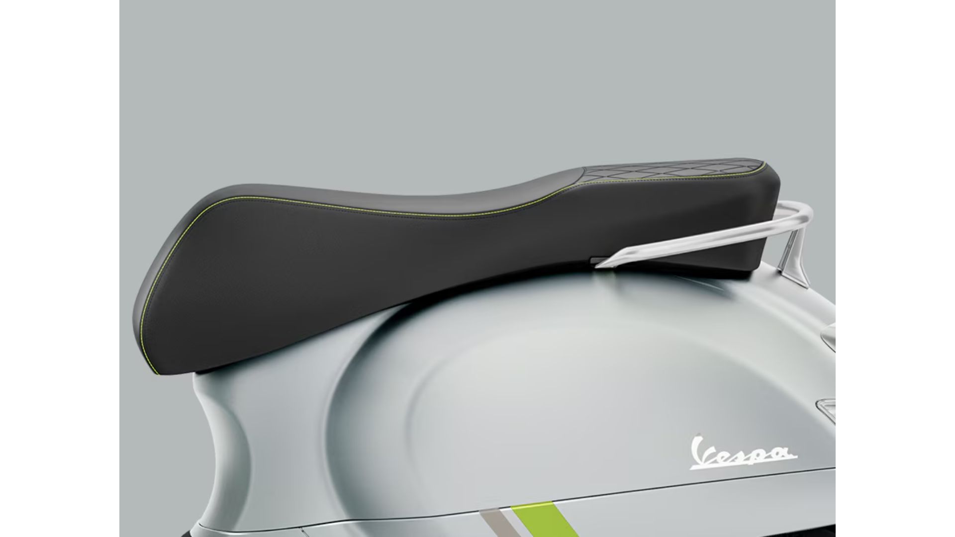 Napredna tehnologija se odlično dopolnjuje z ikoničnim Vespa dizajnom. Kombinacija matiranih in sijajnih površin, skupaj z detajli v fluorescentno zeleni barvi, ustvarja izrazit vizualni kontrast. Sedež iz kakovostnih materialov s kontrastnimi šivi ter osvetljen prtljažni prostor pod sedežem dodatno poudarjata premium občutek.